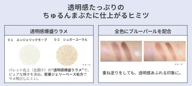 エテュセがこれまで展開してきた2色アイシャドウの“異なる質感レイヤード”というコンセプトを拡張し、今回はベース・彩りカラー・影色・ラメという4つの質感を組み合わせる設計により、重ねるだけで「ちゅるん」とした透明感のある目もとを実現することに注力しています。全色にブルーパールを配合し、重ねても透明感が損なわれない点を特長としています。