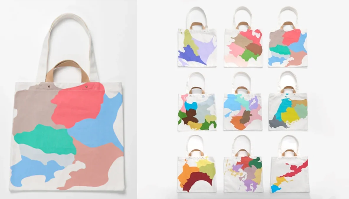 オンラインストア担当 伊藤のおすすめは、肩掛けと手持ちの2way仕様を持つスクエアトートバッグが入った福袋である。バッグには地図を大胆にデフォルメしたデザインが用いられ、地域は9つの地方(北海道/東北/関東/中部/近畿/中国/四国/九州/沖縄)から選択できる。