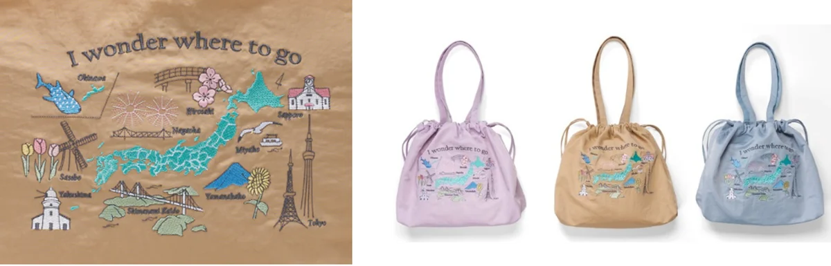 | 刺繍入りドローストリングバッグ入り福袋 | 日本列島イラストマップに10エリアの観光スポット刺繍。3色展開 | 5,500円 | オンラインストア・店舗 | ラベンダー、ベージュ(店舗限定)、ブルー。総額約11,000円相当 |