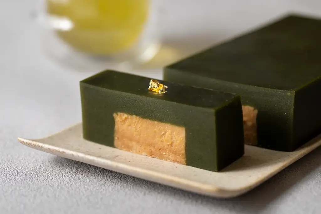 長井市産のはちみつを使用した抹茶羊羹と、長井市で作られる在来種枝豆「馬のかみしめ」から作るきな粉を使ったチーズケーキを組み合わせたデザートです。八芳園の社員が現地を訪れて想いを受け取り開発した一品で、長井市の水で淹れたお茶と合わせて提供されます。