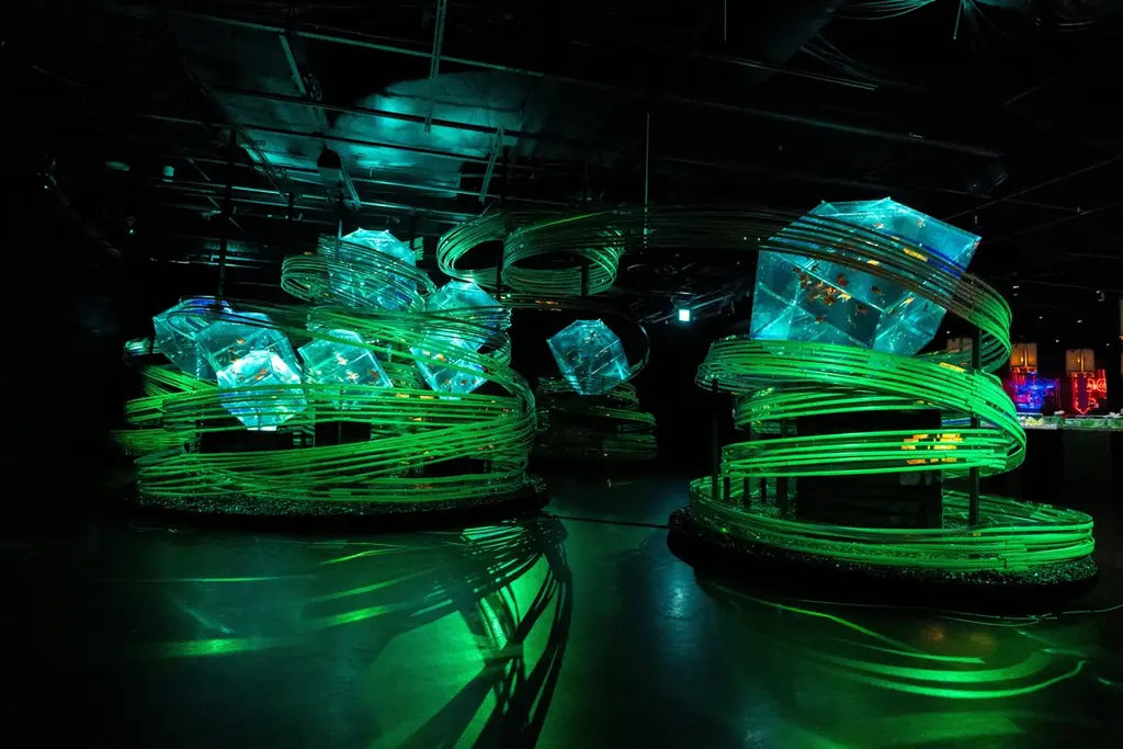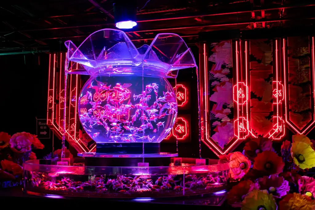 アートアクアリウムは、金魚が泳ぐ水槽作品を光・香・音で演出する没入型エンターテインメントアートです。日本の伝統的な金魚鑑賞文化と現代アート表現が融合した空間が特徴で、来館者は視覚的造形美だけでなく、音と香りによる多感覚の体験を受け取ることができます。