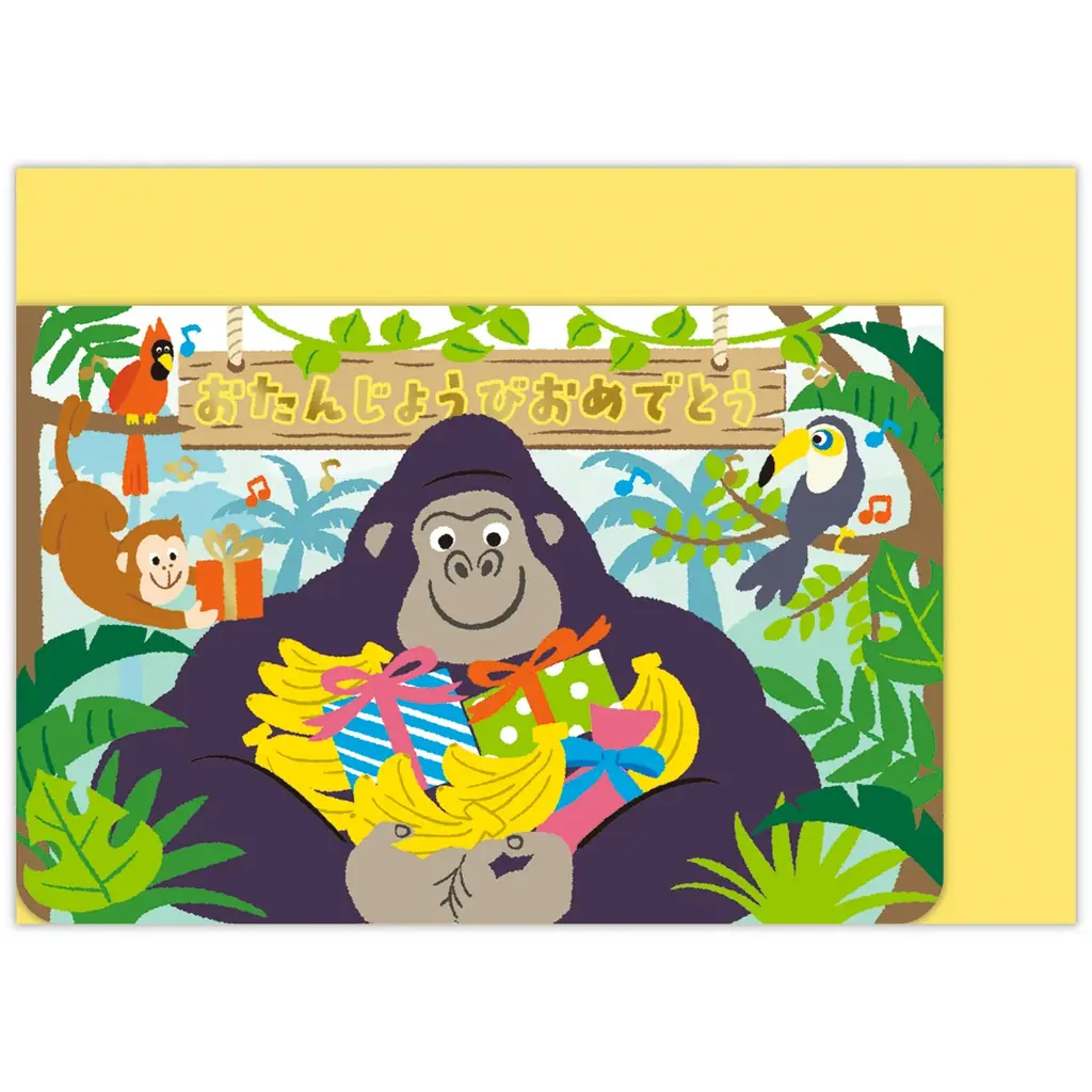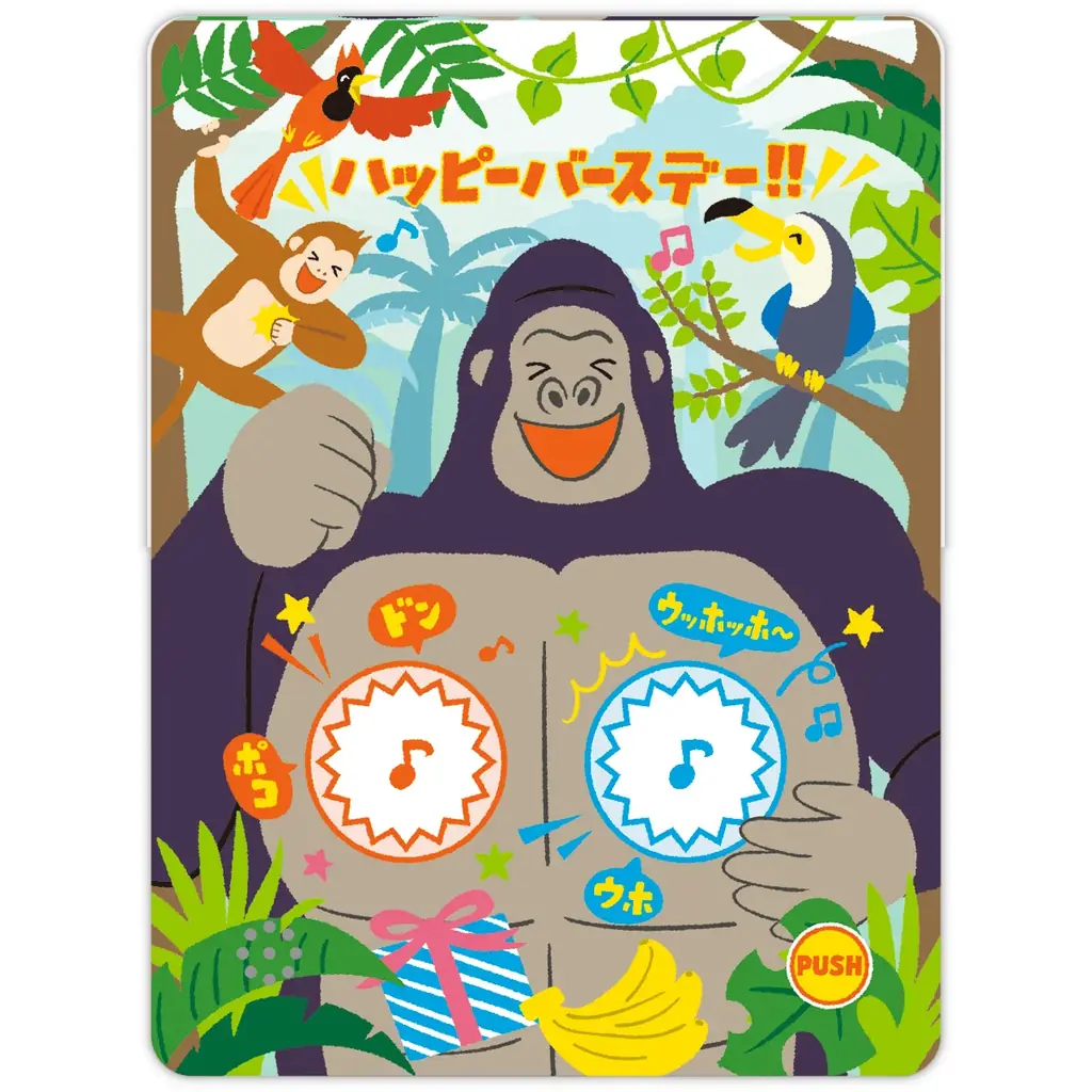 - ゴリラ〈誕生お祝い〉(850302)1,650円(税込) — ゴリラの鳴き声やドラミングなど複数のサウンド、親しみやすいボイスを組み合わせたインパクトのあるオルゴールカード。動画:https://www.youtube.com/watch?v=OUkoFeIQRrs