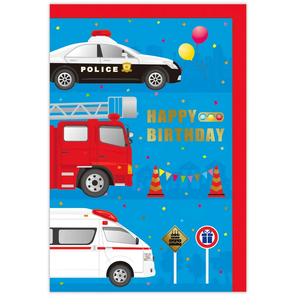 - LEDのりもの〈誕生お祝い〉(850296)1,760円(税込) — パトカー・救急車・消防車をモチーフにサイレン音や光るライトを再現。消防車のはしごは引っ張ると伸びる仕掛け付き。中面にはプレゼントを持った人の標識も配置。動画:https://www.youtube.com/watch?v=hMxEm6PDBwc