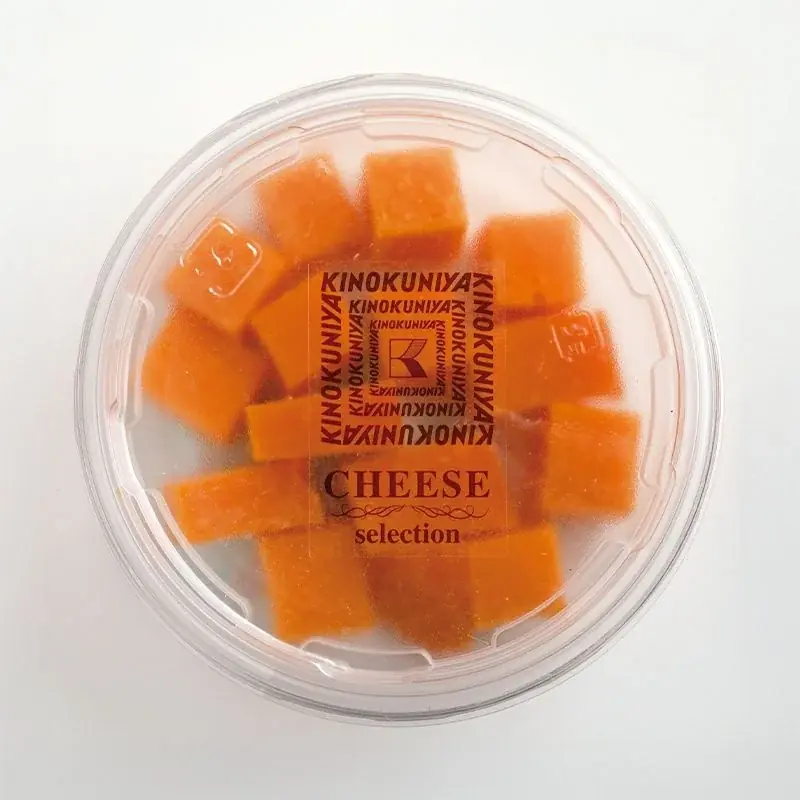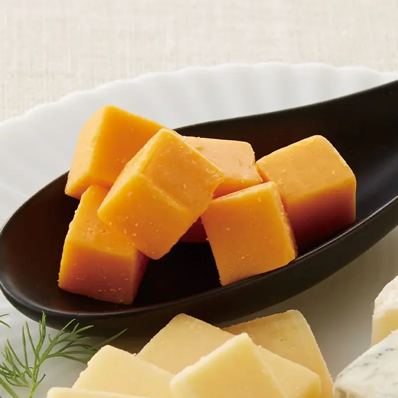 フランス産のミモレットチーズをダイスカットにした商品で、6ヵ月熟成により程よいコクと甘みを備えています。つまんでそのまま楽しむほか、サラダやパスタに加えるなど多用途に使える点が紹介されています。鮮やかなオレンジ色が食卓を彩る点も押されています。