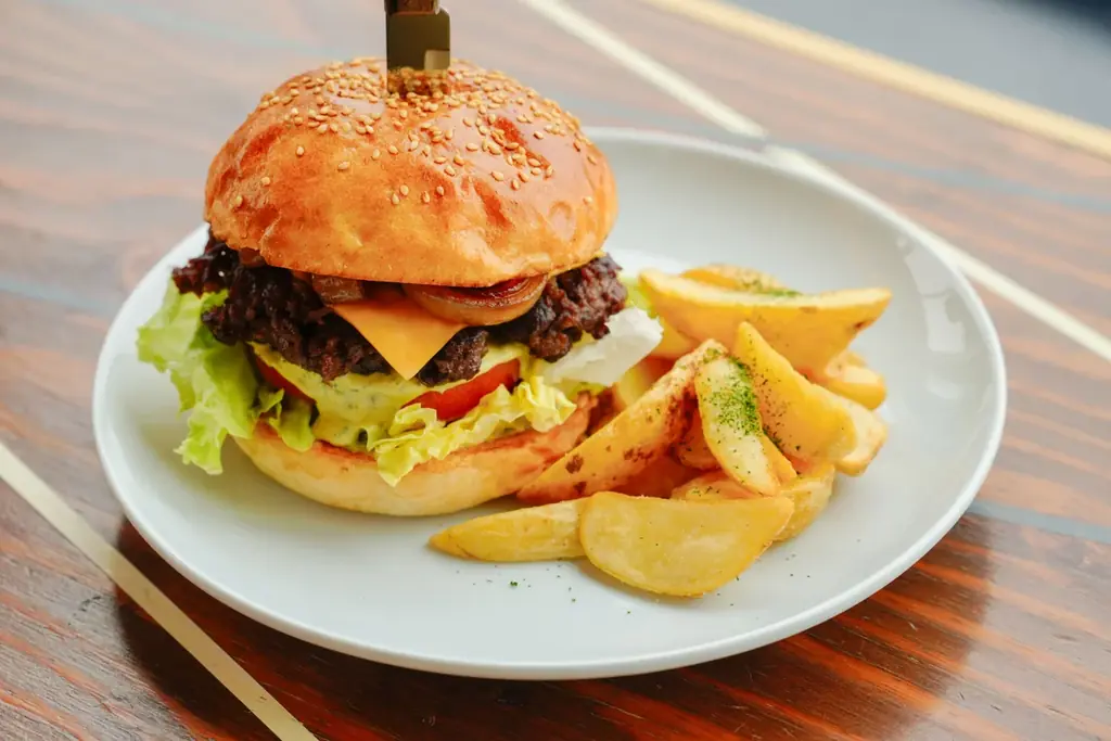 バンズには地元の「頂ベーカリー」と共同開発したブリオッシュ生地を使用し、バターの香りと柔らかな口当たりがパティの味わいを引き立てます。サイドにはフライドポテトを添えて提供されます。