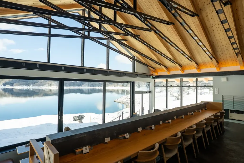 湖畔のテラスは冬期クローズとなりますが、店内では雪景色と青木湖の深いブルーを眺めながら過ごす、落ち着いた時間が用意されています。ウィンタースポーツ帰りや雪景色を楽しむドライブの合間、湖畔の静寂を味わいたい来訪者に向けたメニューと体験を組み合わせた提案が特徴です。