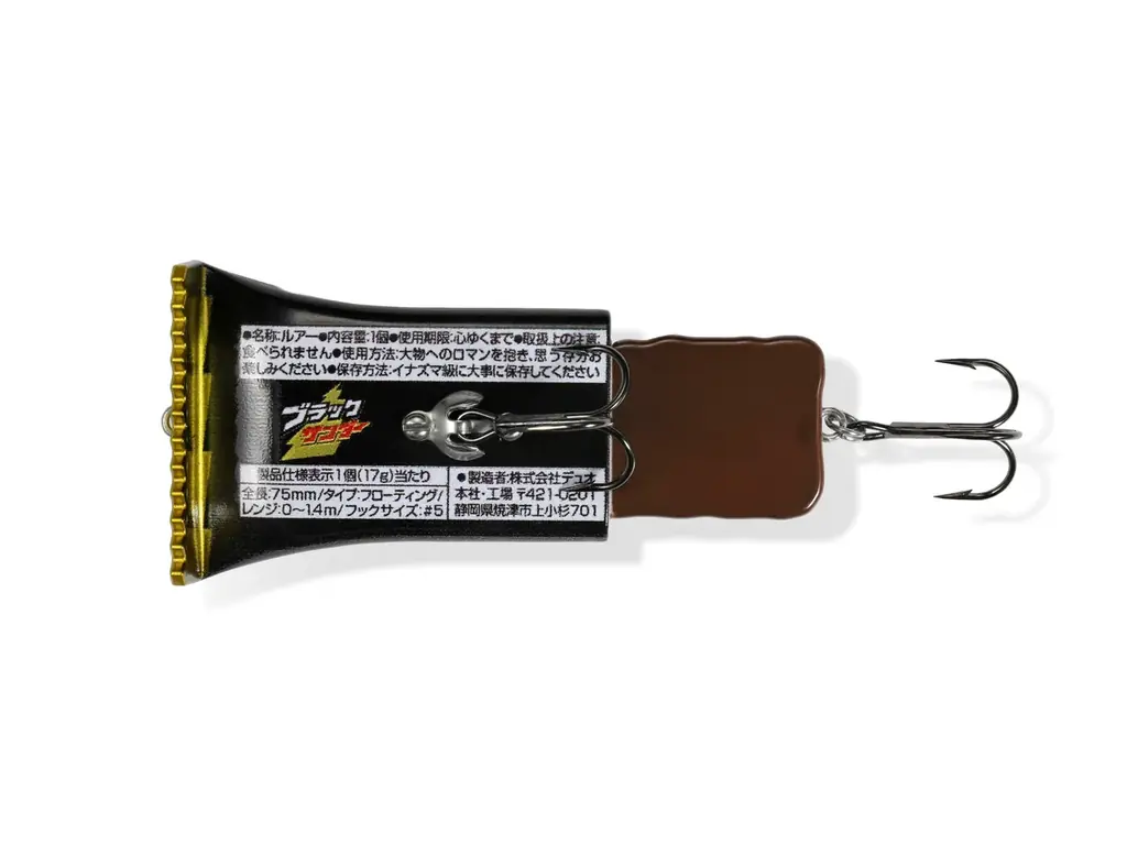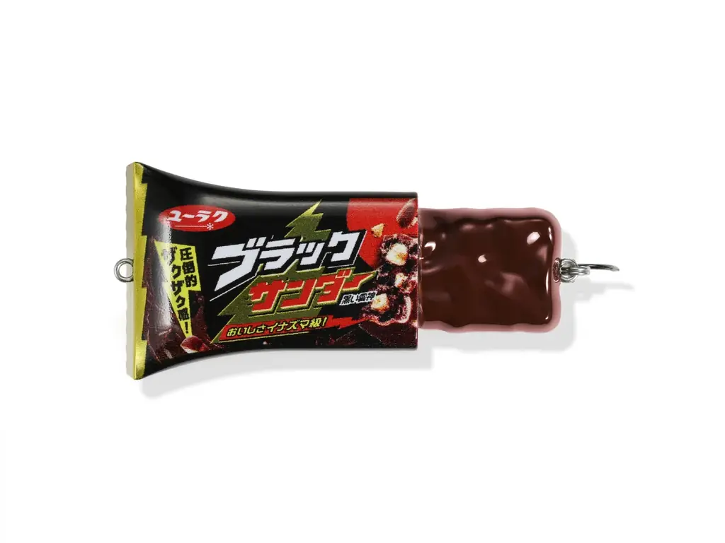 今回のブラックサンダールアーは、有楽製菓の代表的商品であるブラックサンダーのデザインと、DUOのルアー開発技術を組み合わせた特別仕様であり、見た目の再現性とルアー本来の性能を両立させた点が特徴です。実際に魚が釣れた場合、魚がブラックサンダーを捕食しているように見える演出効果も意図されています。