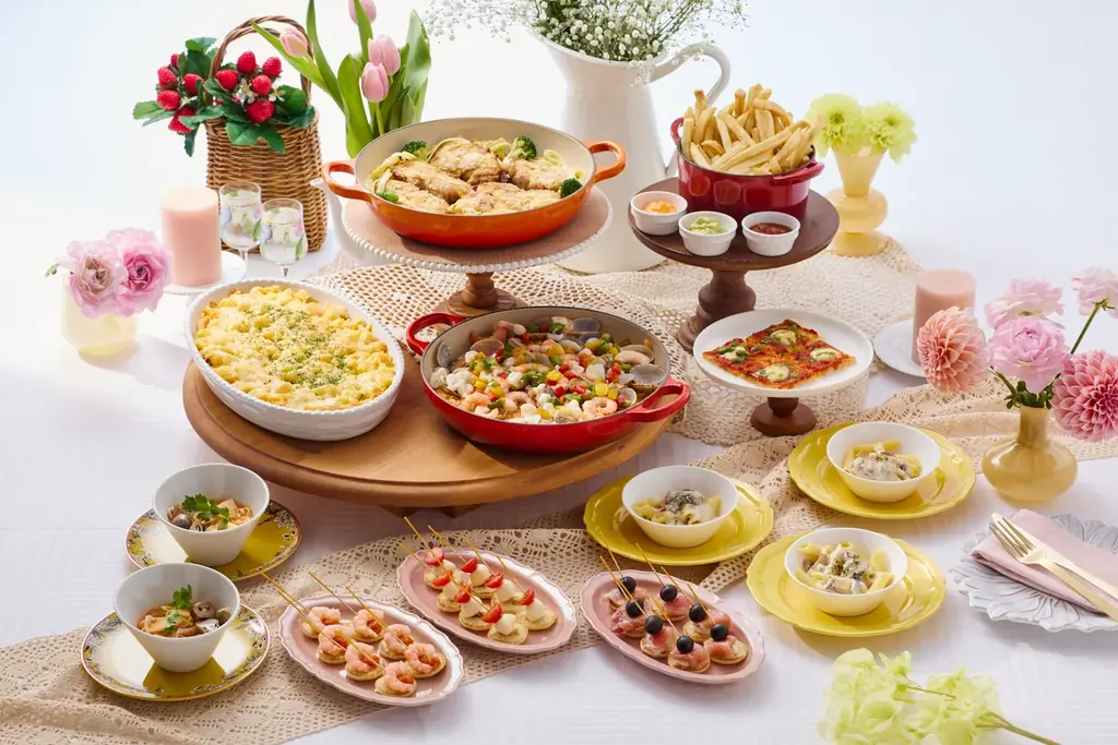- セイボリー(全12種の例):サラダブッフェ、選べるピンチョスブリニ、チキンディアボラ(特製デミグラスソース)、フレンチフライ(選べるソース)、きのこのクリームパスタ、シーフードピラフ、トムヤムヌードル、マルゲリータ ピッツァ 等