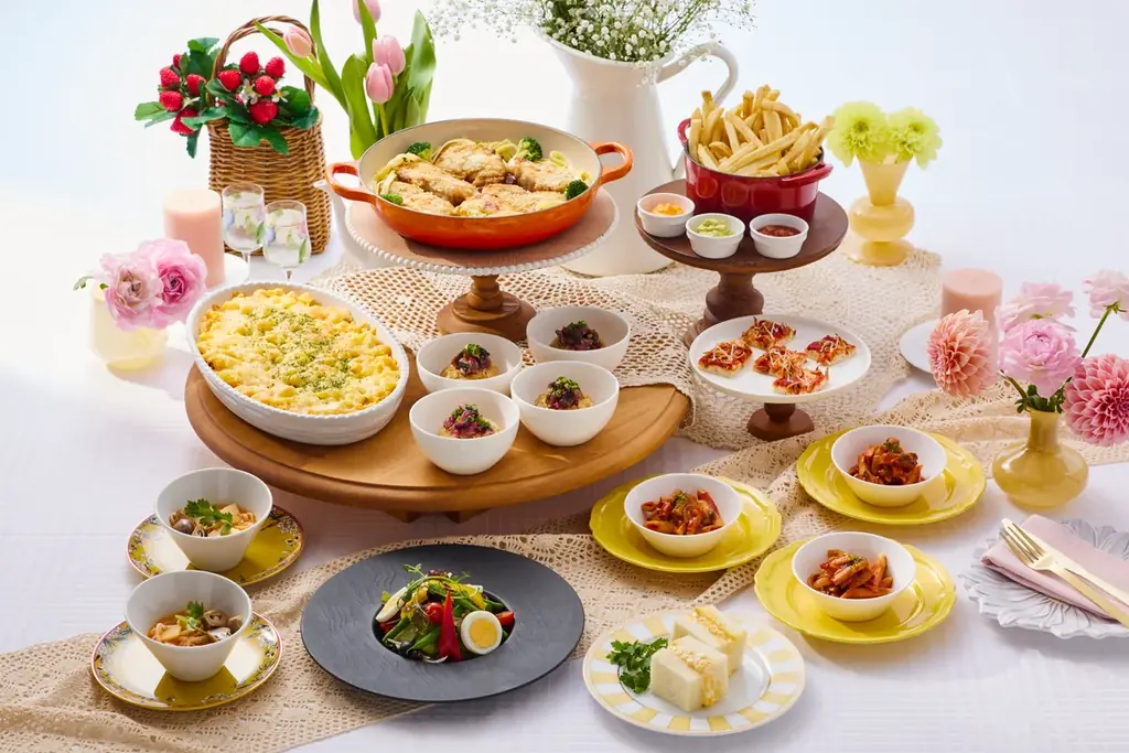 - 【後半セイボリー】目の前で仕上げる特製サラダ、たまごたっぷりサンド、チキンディアボラ(特製デミグラスソース)、フレンチフライ(選べるソース)、昔ながらのナポリタン、カツオと柴漬けの香味丼、トムヤムヌードル、桜えびのピッツァ ほか全12種