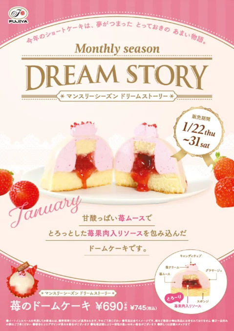 | Monthly season DREAM STORY ~苺のドームケーキ~ | 2026年1月22日(木)~1月31日(土) | 745円 | 苺ムースで苺果肉入りソースを包むドーム形、10日間限定 |