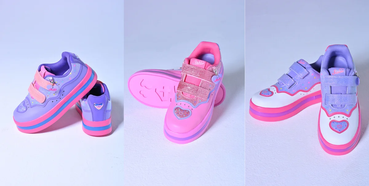 本コラボモデルは、トレンド感の高い女子小中学生を主要ターゲットに、歩行に合わせてソールが光るライトアップ機能や、砂の上を歩くと「Shinako」ロゴが足跡として浮かび上がるロゴアウトソールといった遊び心あるギミックを搭載しています。チャーム・シュータン・インソールにもロゴやモチーフが配され、どの角度から見てもデザイン性の高い一足に仕上げています。
