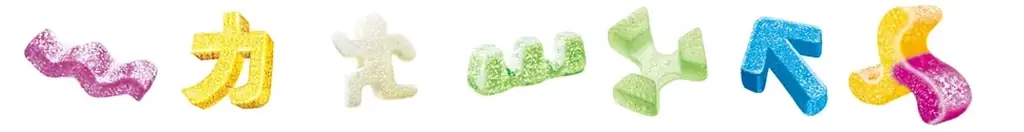 特徴:独自の形状から生まれるハードな弾力食感。ラムネ味、グレープソーダ味、コーラ味の3種の炭酸飲料味を楽しめる。