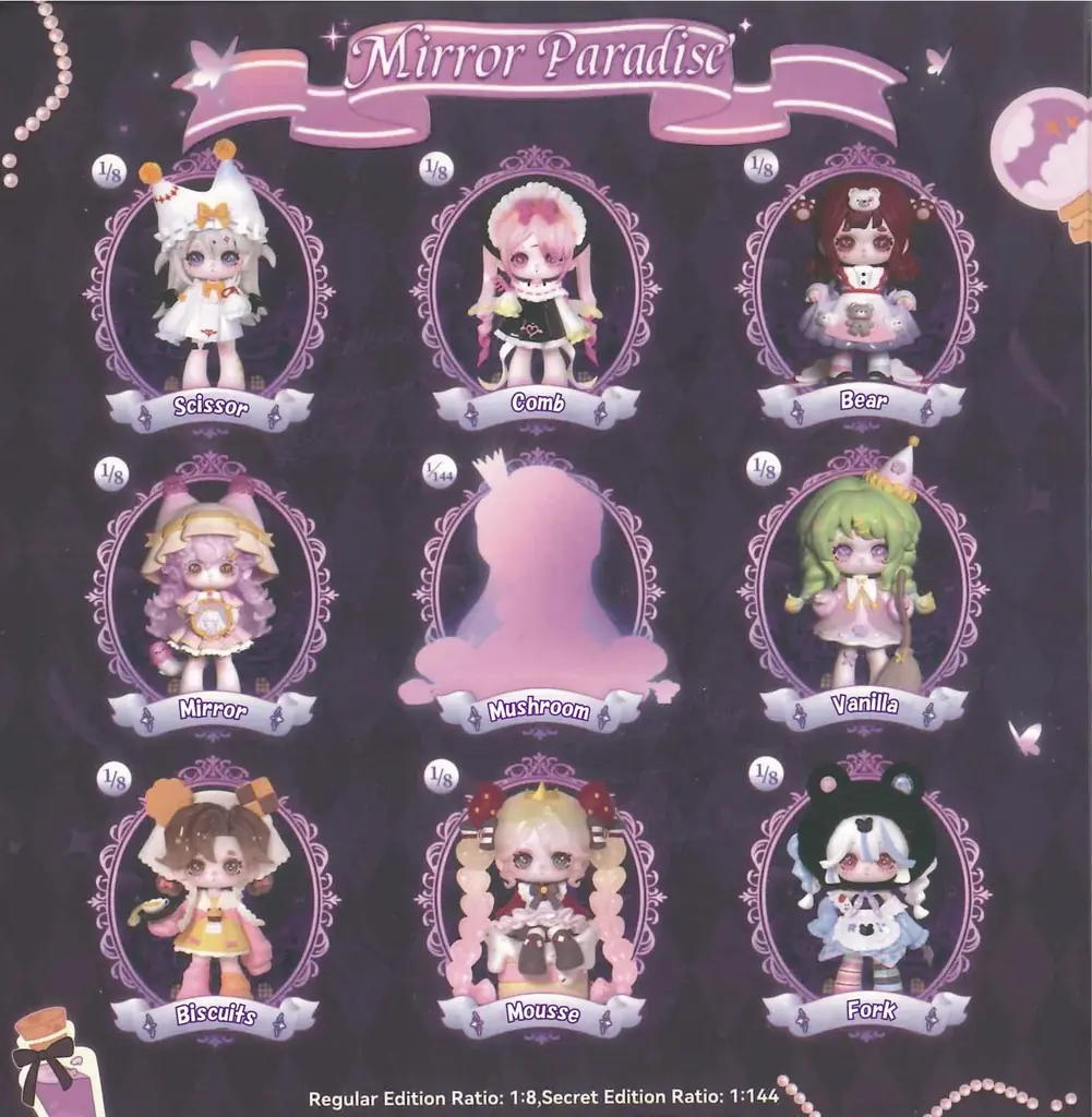 パッケージを開けた先に広がる世界観は「魔鏡楽園(ミラーパラダイス)」と銘打たれており、個性的なキャラクターデザインとポップな色調、細部にわたる造形のこだわりが特徴です。コレクション性を高めるためにシークレットキャラクターが含まれており、全9種(通常8種+シークレット1種)のラインナップ構成となっています。