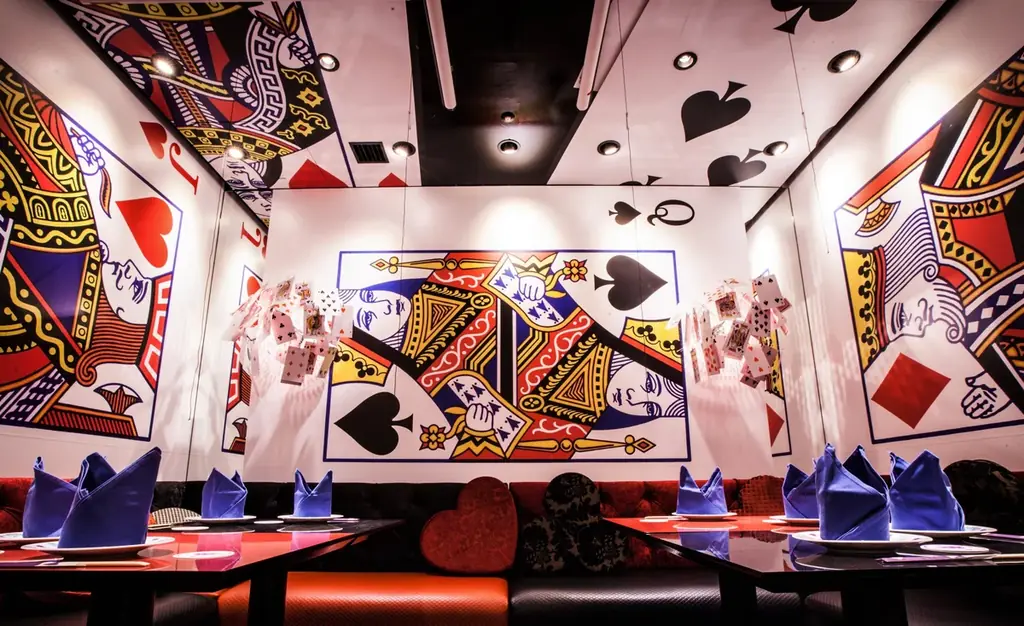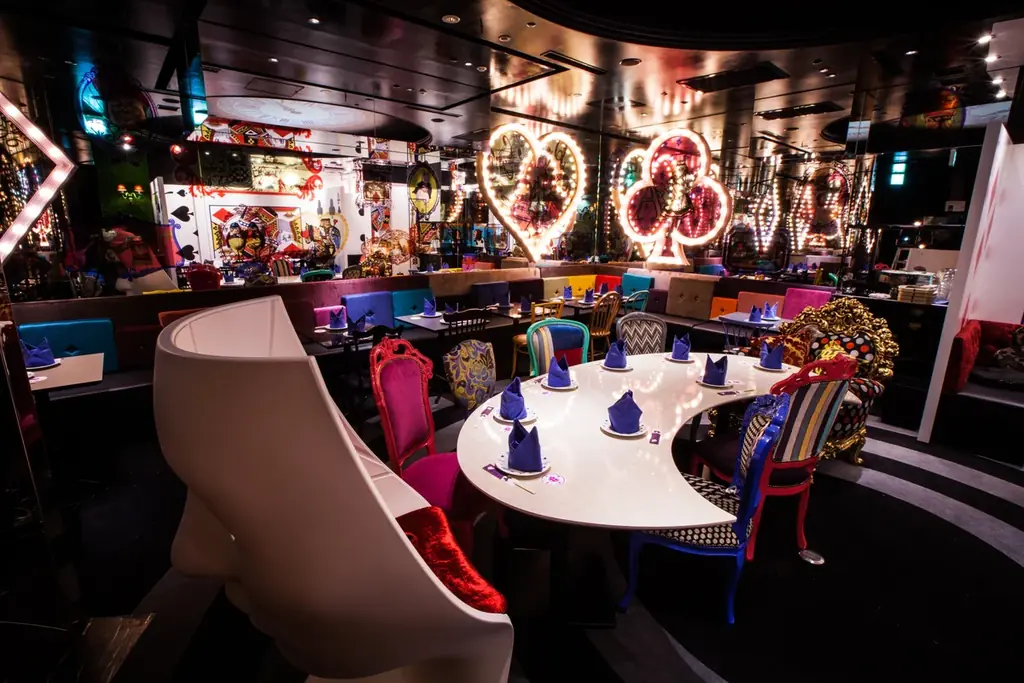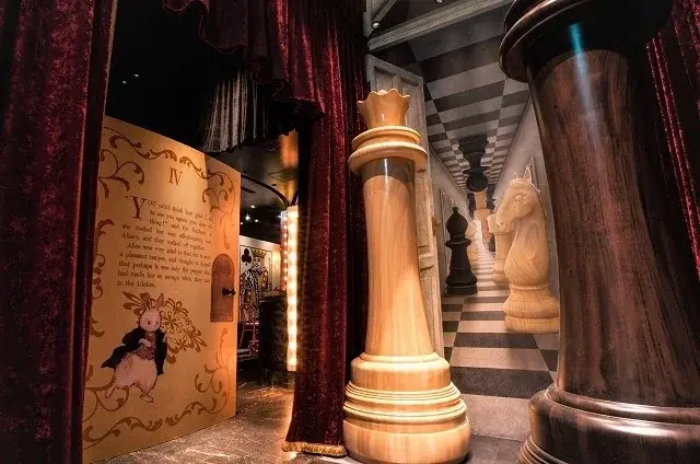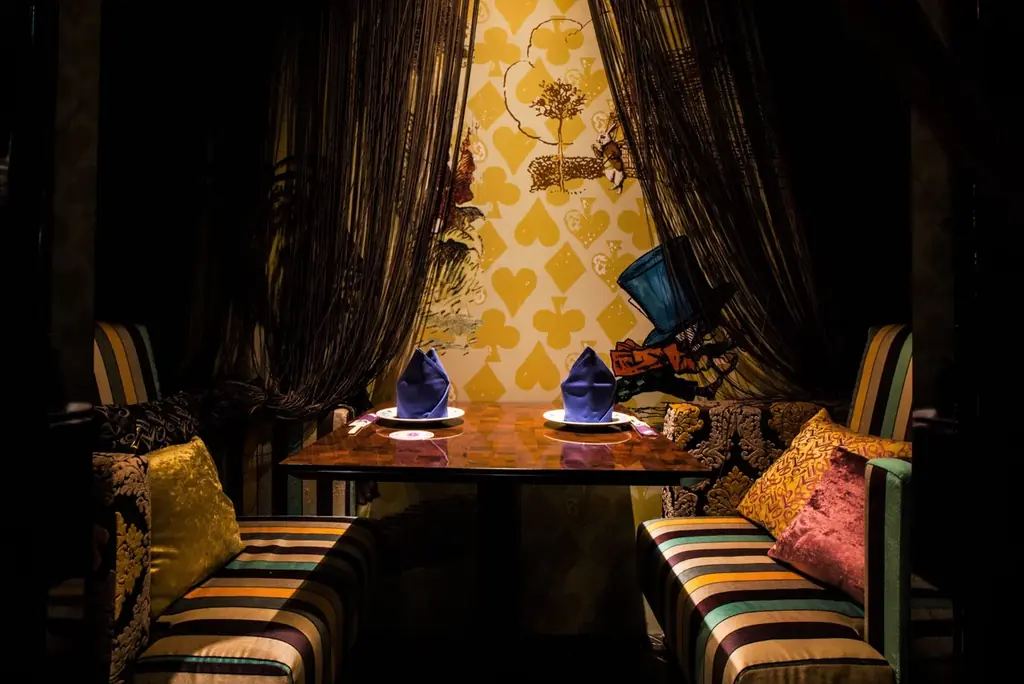 「幻想の国のアリス」は阪急梅田駅から徒歩1分、JR大阪駅から徒歩5分の立地にあり、非日常的な空間を売りにしたファンタジーレストランです。英国文学『不思議の国のアリス』をモチーフに、内装や席ごとの演出を細かく設計しています。