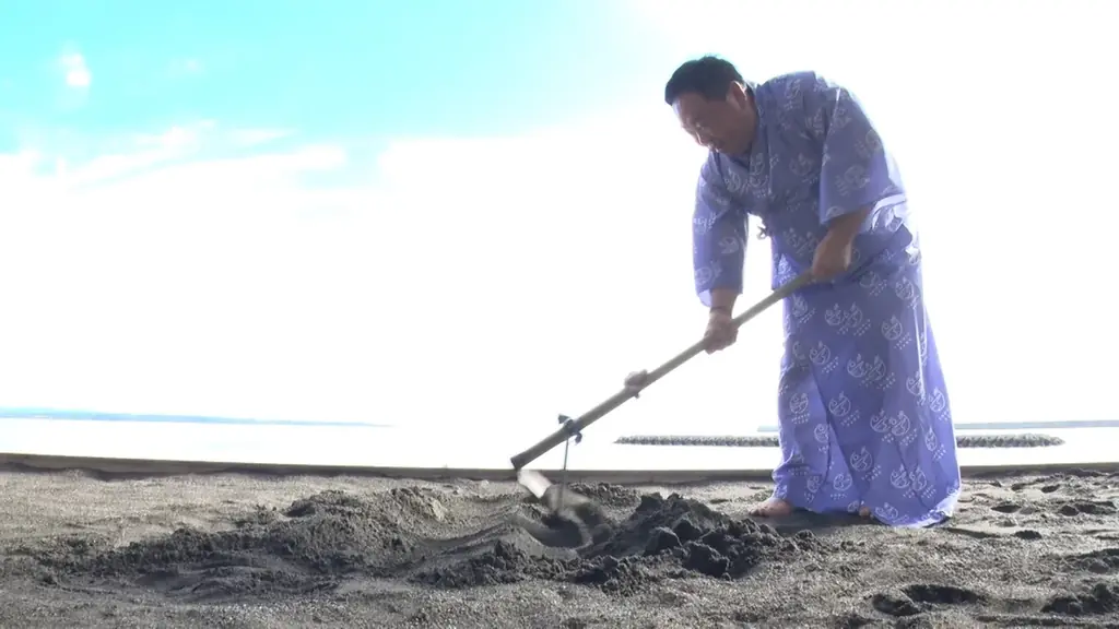 砂湯は別府を代表する温泉文化のひとつで、海岸に設けられた砂場に寝転び、温かい砂で体を覆って温まる入浴法です。番組では塚地が浴衣姿で砂に埋まる様子が描かれ、力士のような見た目に触れつつも、深くリラックスする場面が丁寧に説明されます。