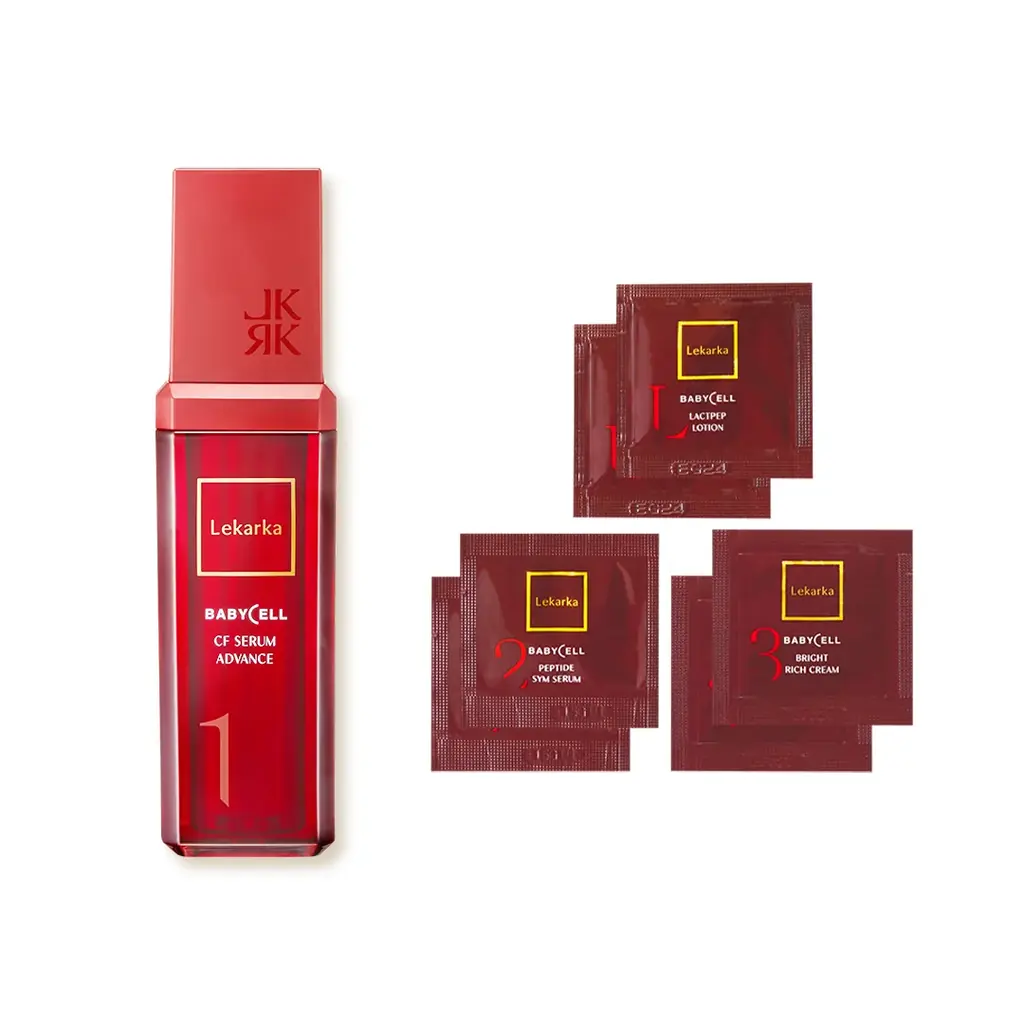 - 同梱内容:CFセラムアドバンス(30mL)+ラクトペプローション(1mL)2包+ペプタイドシムセラム(1mL)2包+ブライトリッチクリーム(0.5g)2包
