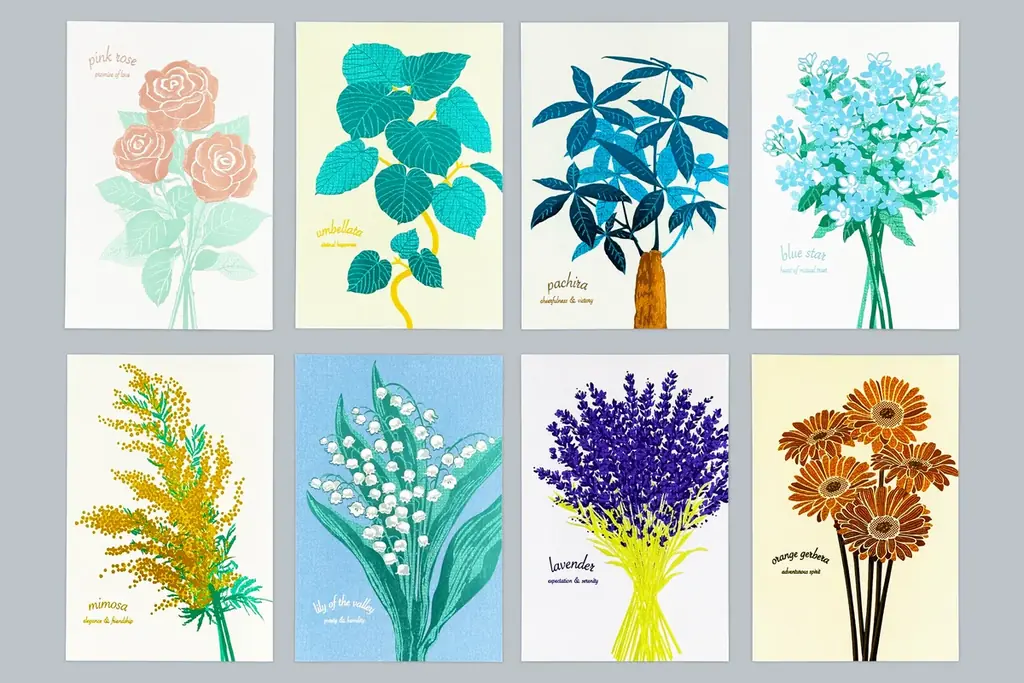 - ポストカード:8種(バラ、ウンベラータ、パキラ、ブルースター、ミモザ、スズラン、ラベンダー、ガーベラ) 各330円
