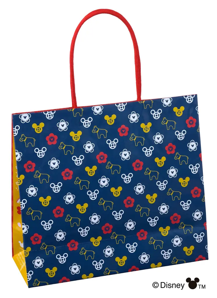 バッグの表面には着物姿であいさつをする「ミッキーマウス」や「ドナルドダック」を配し、裏面には2026年の干支にちなむ「午(うま)」や「ミッキー」アイコン柄を組み合わせた意匠になっています。パッケージデザインが商品全体のテーマ性を強め、年始にふさわしい雰囲気を演出しています。