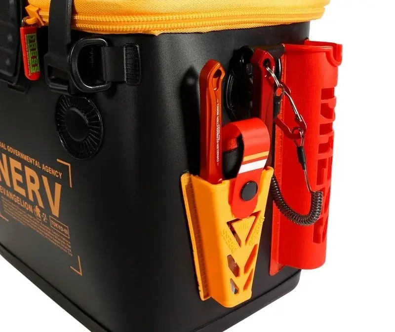 バッカンミニは2号機のテーマカラーに「NERV」ロゴをあしらった限定デザインで、ロッドホルダー3本、プライヤーホルダー付きの収納性を確保しています。EVA素材を採用し丸洗いが可能、耐久性に優れたTPUショルダーベルトも搭載しています。