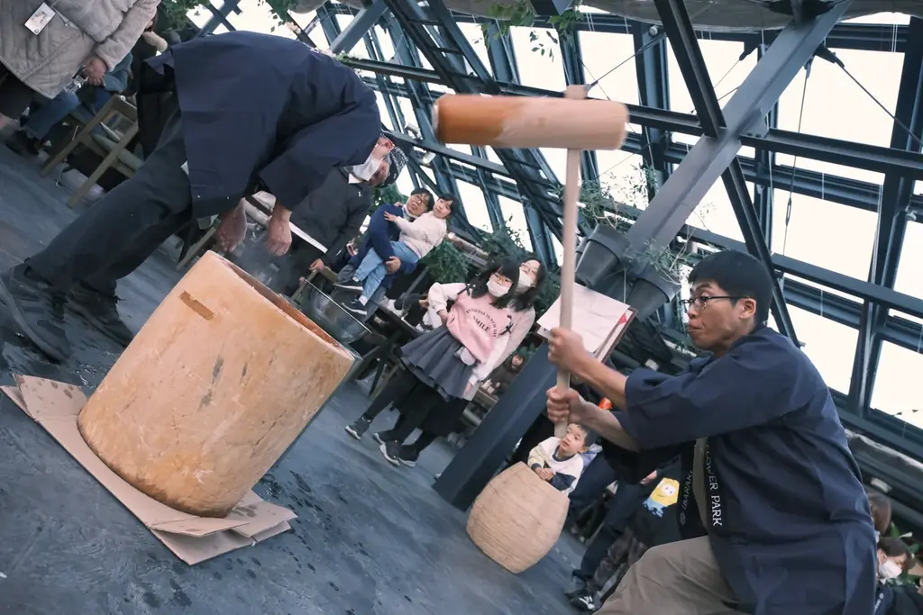 八郷地区に残る年末の餅つきの伝統を紹介するため、園スタッフによる伝統的な手順(蒸す・練る・餅をつく)での実演と、来場者参加型の餅つき体験を実施します。整理券の配布と無料配布の詳細は以下の通りです。