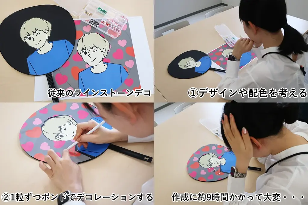 本商品の開発背景には、推し活と仕事や育児の両立に悩む利用者の声がありました。時間やセンスの問題で「うちわデコ」を諦める人に対して、印刷技術で解決するアプローチが取られています。社内アンケートやモニター調査を通じて得た要望を反映した設計です。