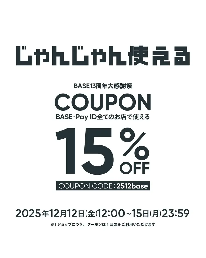 | キャンペーン | 2025/12/12 12:00〜2025/12/15 23:59:BASE 15%オフクーポン(コード:2512base) |