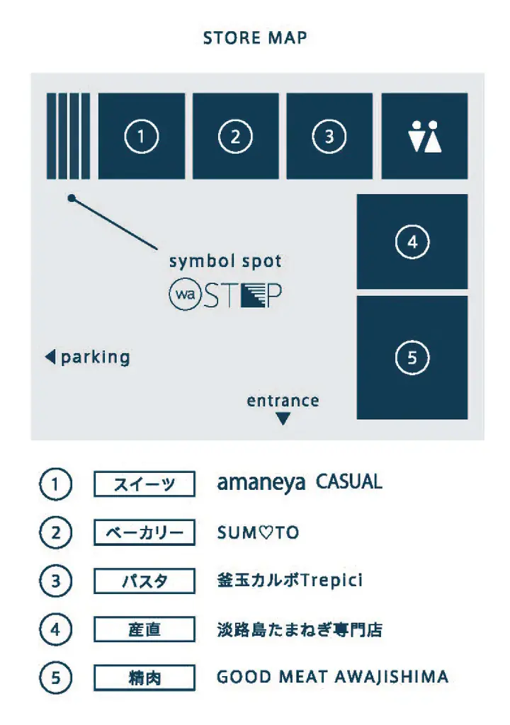 | 注目店舗(代表例) | amaneya CASUAL(和菓子カフェ)、釜玉カルボ ‘Trepici’(生パスタ)、淡路島たまねぎ専門店、sumheart(カレーパン)、GOOD MEAT AWAJISHIMA(精肉) |