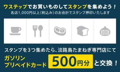 - 対象:waSTEP AWAJISHIMA内の各店舗(1000円以上の購入でスタンプ付与)