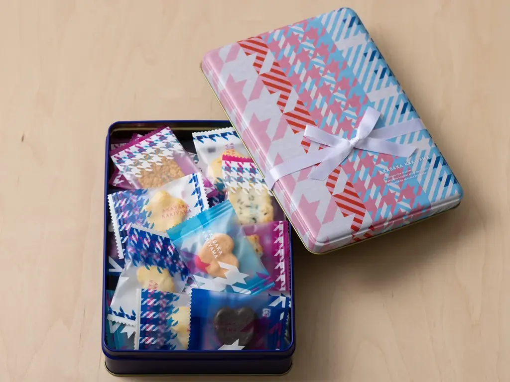- <赤坂柿山>レトロ缶 1缶(26枚入) 2,160円。チョコ掛けおかきやダブルチーズなど6種を詰め合わせ。