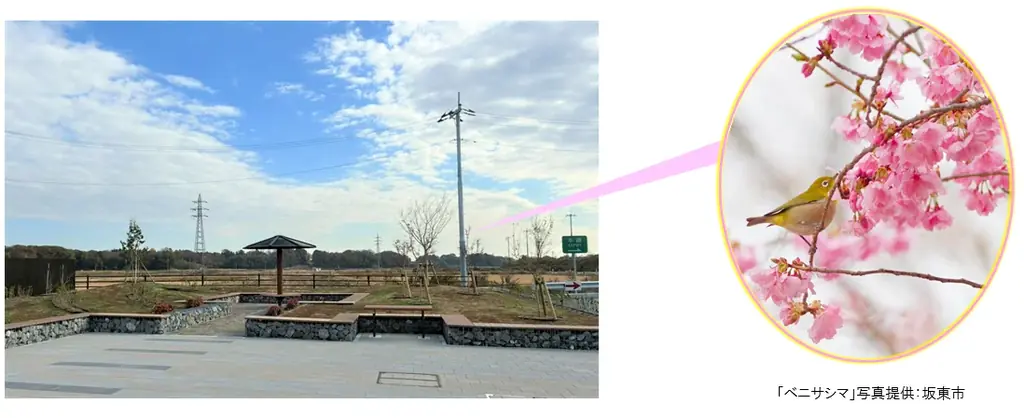 外構や園地には、坂東市の地域の桜である「ベニサシマ」を植栽し、地域の景観や季節感を演出します。ベンチ類は各所に配置され、個々のパーソナルスペースを確保しながら、運転による疲労回復や休息の機会を提供する設計となっています。