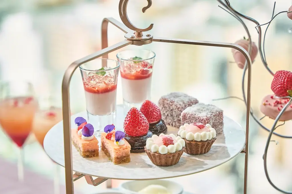 - 上段(3段スタンド): 苺チョコレートタルト、苺パンナコッタ(シャンパンジュレ)、苺のガトーショコラ、苺ラミントン、苺NYチーズケーキ