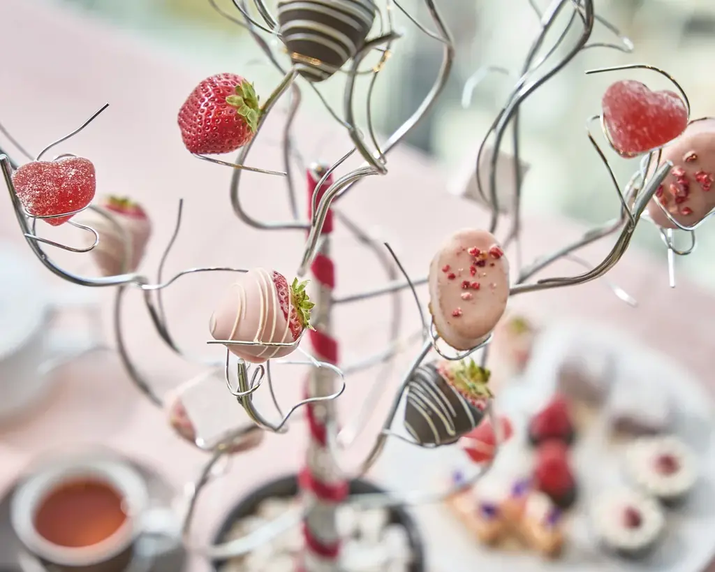 ツリー型スタンドには、ストロベリーチョコレートとミルクチョコレートにディップしたチョコ苺(2種)やフレッシュ苺、苺ギモーブ、苺チョコフィナンシェ、苺パートフリュイなどが並びます。手軽につまんで味わえる構成のため、カジュアルなティータイムの演出に適しています。