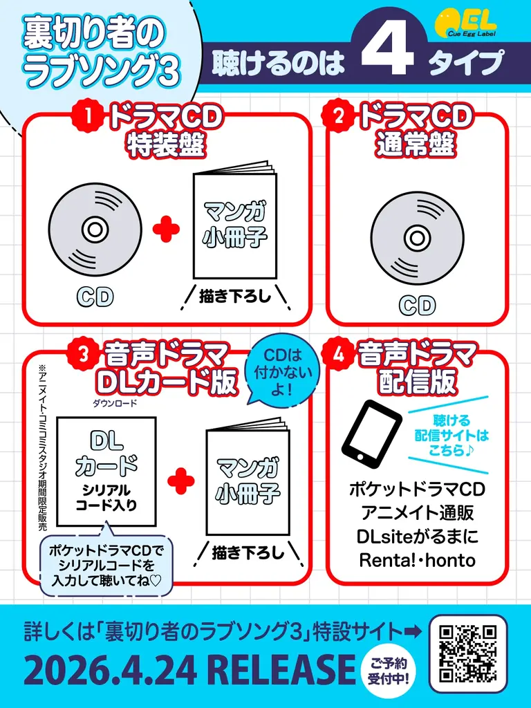 株式会社リブレは、外岡もったす原作のドラマCDシリーズ「裏切り者のラブソング」の音声ドラマ第3弾を、2026年4月24日(金)に発売および配信すると発表しました。発売形態はCDの物理商品とデジタル配信を含む複数タイプで、同日配信も行われます。