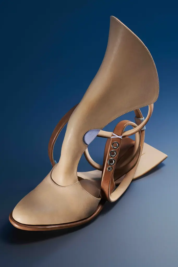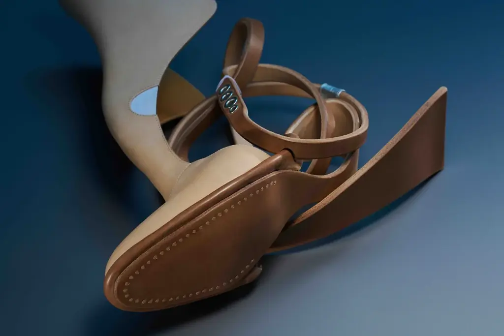 具体的には、インソールとアウトソールを繋ぐウェルト部分を空洞構造にして、楽器の管のような「通り道」を靴に組み込んでいます。これは単なるモチーフ表現に留まらず、楽器の本質的構造を靴の設計に転換する実践です。