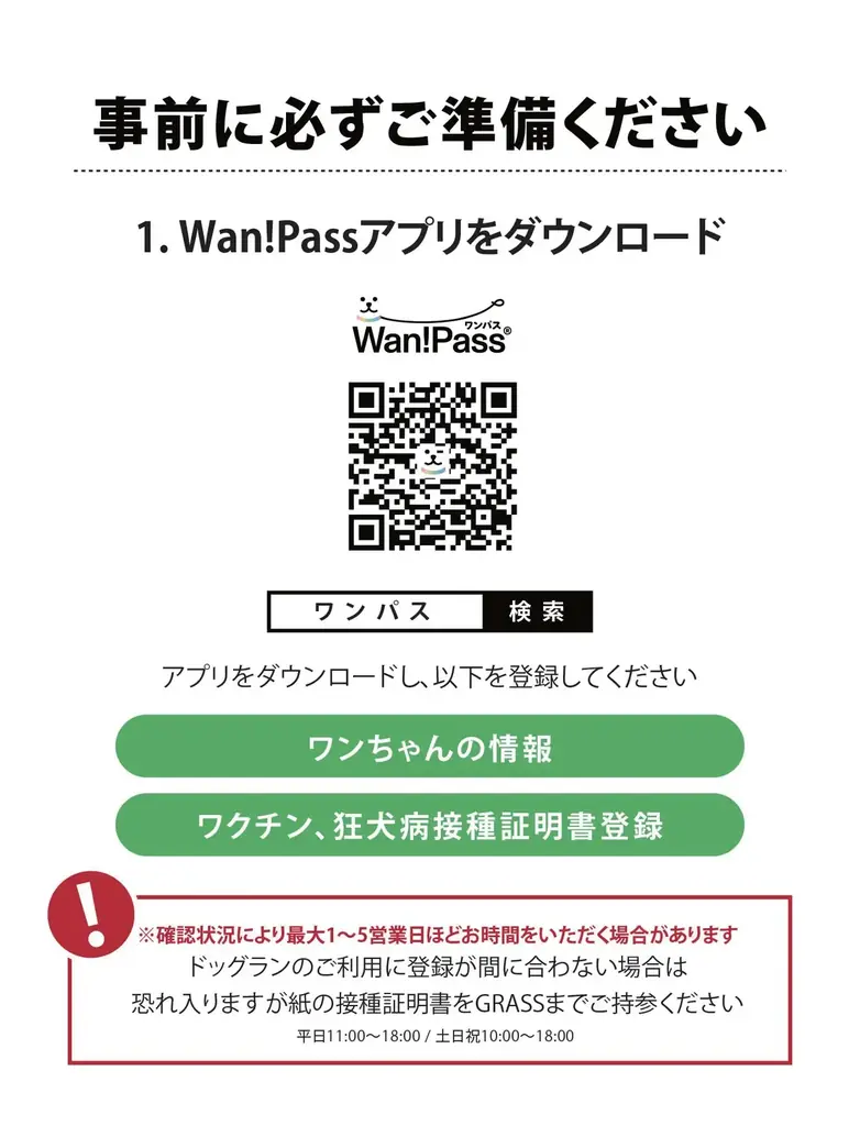 ドッグランの利用にはWan!Passへの事前登録が推奨されています。登録にはワクチン接種および狂犬病予防接種の証明書の提示・登録が必要です。イベント参加を確実にするため、イベントの5日前までの登録が推奨されていますが、店舗(GRASS)にて18時まで直接登録を受け付けることも可能です。