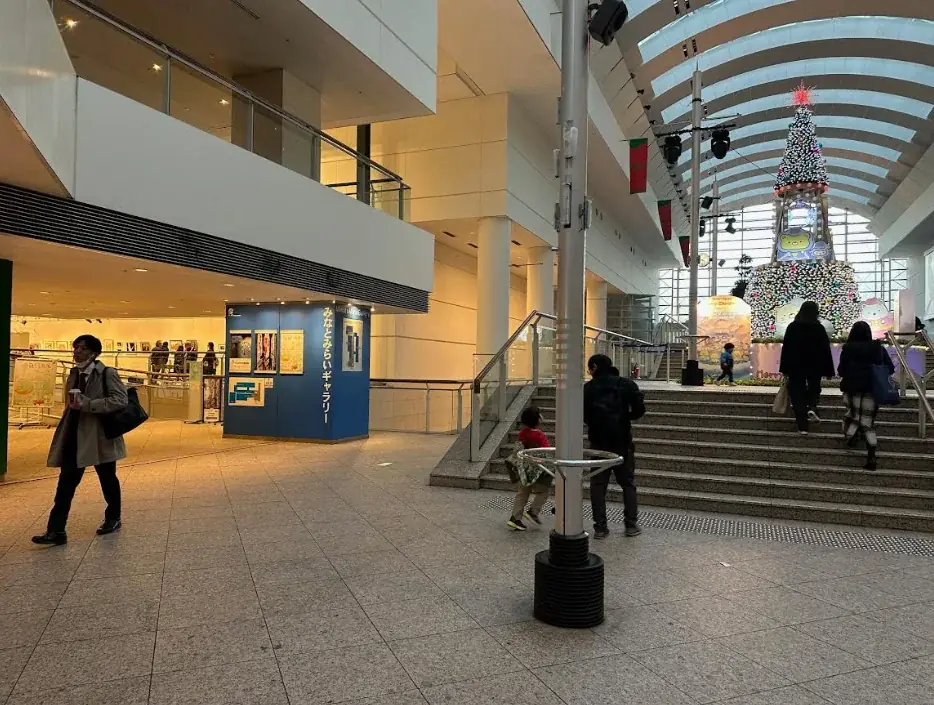会場の位置は、地下3階の駅からエスカレーターで2階へ上がり、ディズニーとサンリオショップの奥にあります。案内表示では「赤矢印の場所」との記載があります。ギャラリーはみなとみらいを真正面に望むロケーションで、目印として大観覧車が視界に入る位置です。