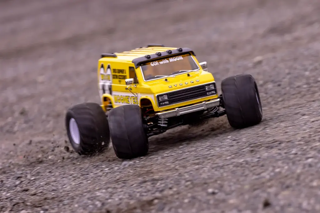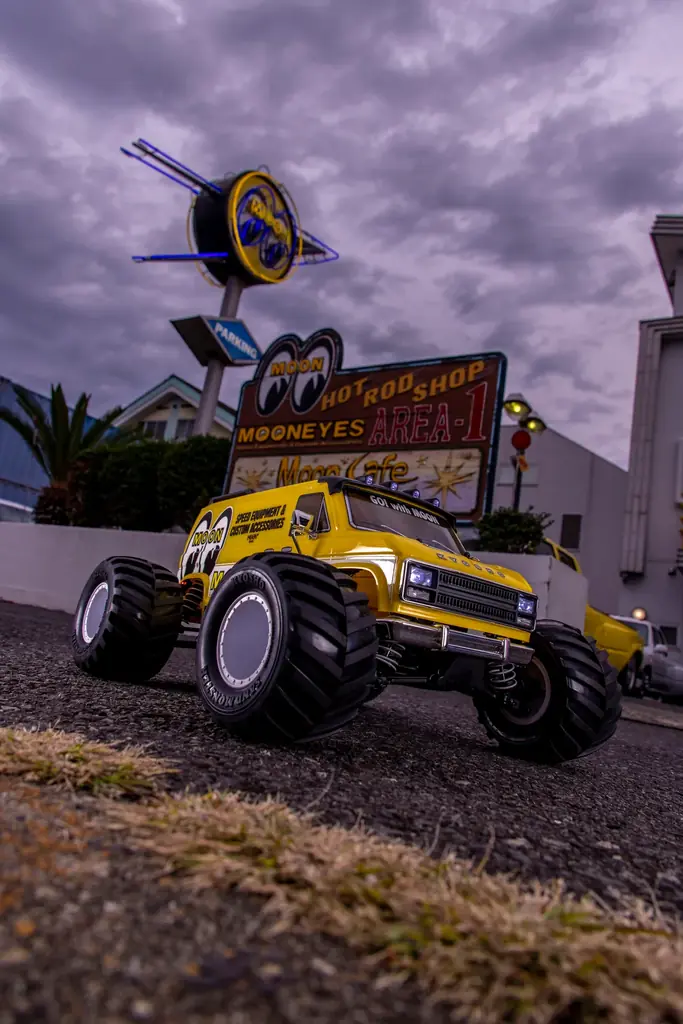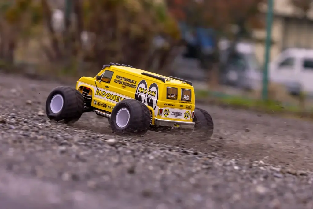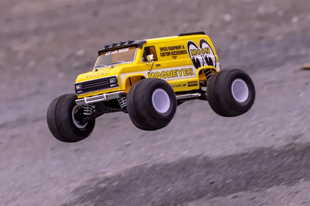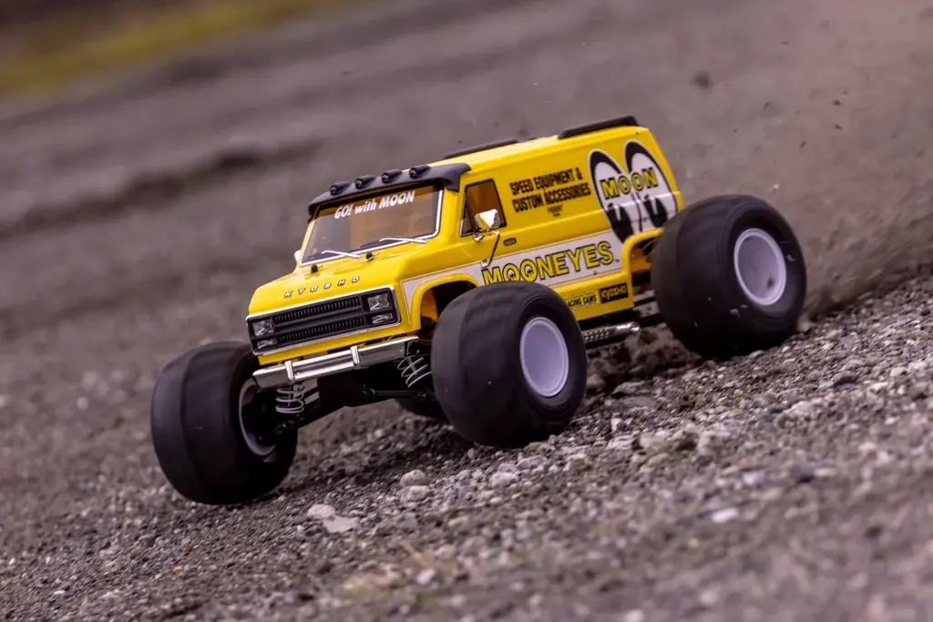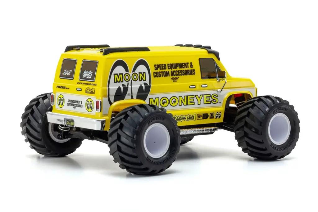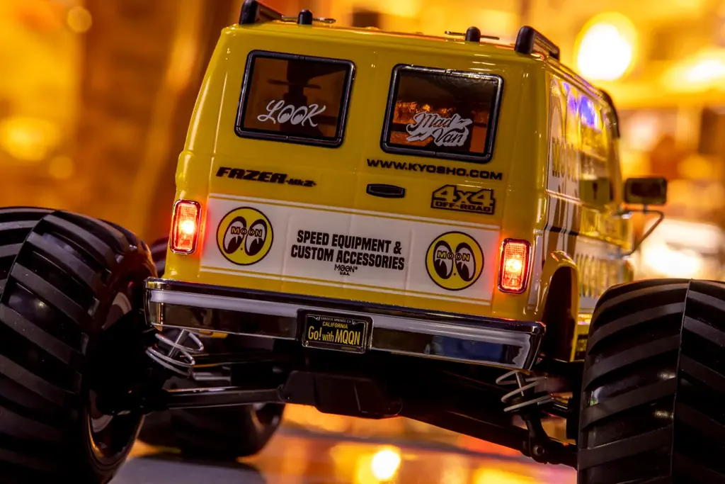 ボディはポリカーボネート製で、1970〜1980年代の角張ったアメリカンフルサイズバンをイメージしたデザインを採用。MOONEYESによるオリジナルカラーリングはメタリックの輝きによりボディの立体感を際立たせる仕様で、ファニーな雰囲気を強調する大径&ワイドタイヤとの組み合わせが特徴だ。