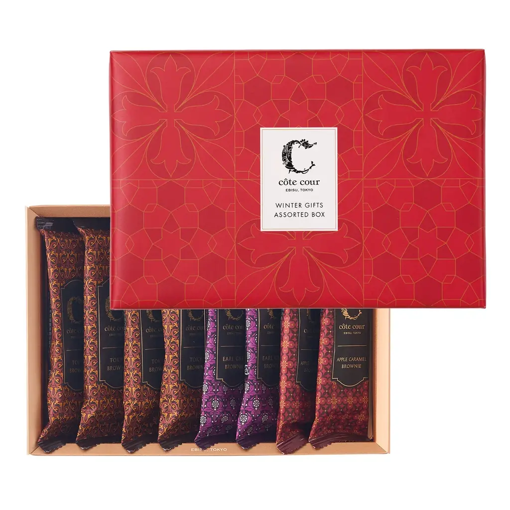 「ブラウニー詰合せ Winter Giftパッケージ」には、コートクールが得意とする3種類のブラウニーを詰め合わせています。力強いカカオ風味の定番「東京ブラウニー」、紅茶の香りが広がる「アールグレイブラウニー」、そして期間限定の「林檎キャラメルブラウニー」です。