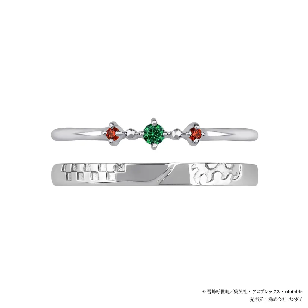 炭治郎をイメージしたリングは、センターに緑色のストーンを配し、側面には「ヒノカミ神楽」や炭治郎の瞳を想起させる赤いストーンをあしらっています。地金には羽織の市松模様と額の痣を刻印し、中央には日輪刀を思わせるデザインが施されています。