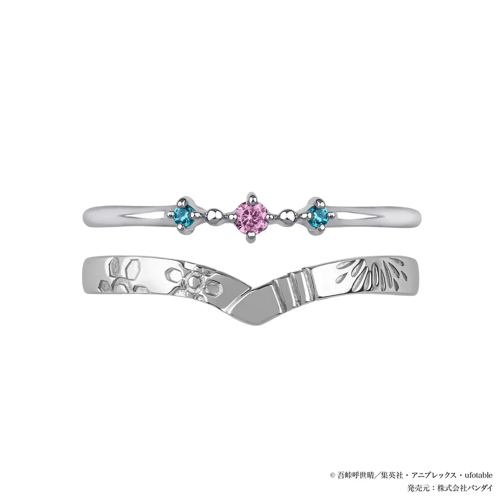 狛治と恋雪をイメージしたリングは、センターストーンに恋雪の着物を想起させるピンク、サイドに狛治の目の色を思わせる水色のストーンが配されています。V字にデザインされたリングは着物の衿をイメージしており、恋雪の髪飾り、狛治の腕、そして二人が誓い合った場面の花火を刻印で表現するなど、物語性を強く打ち出しています。