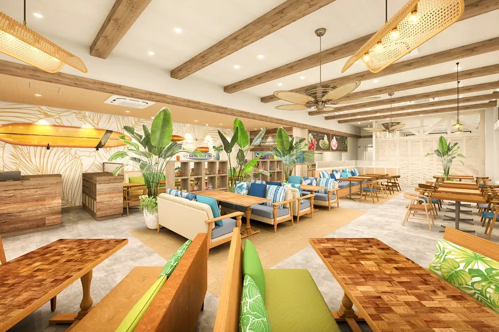 店舗はゆったりとしたハワイアンリビングのような内装を想定しており、買い物の合間にリラックスできる滞在を提供する点が強調されています。