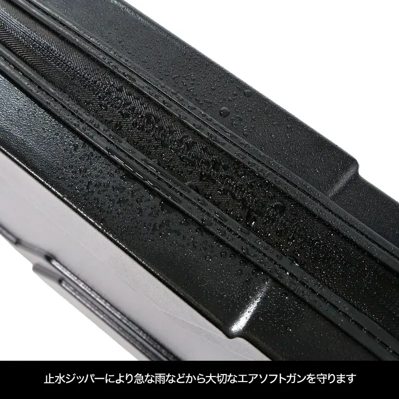 止水ジッパーを採用しており、ジッパーの隙間からの水の侵入を抑える構造になっています。移動中の急な雨やフィールドで濡れた地面に置いた場合でも水濡れリスクを軽減する設計で、電動ガンや光学サイトといった水濡れに弱い装備を持ち運ぶユーザーに対して重要な保護を提供します。