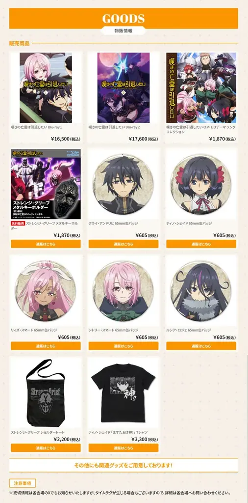 | 物販の主な商品 | Blu-ray(各16,500円)/OP・EDテーマ(1,870円)/アクリルスタンド等(1,650円~)/缶バッジ(605円) 他多数(発売元表記あり) |