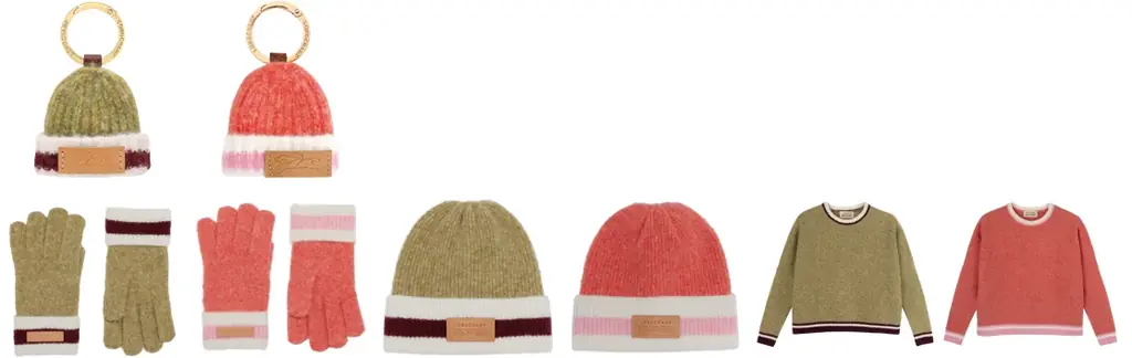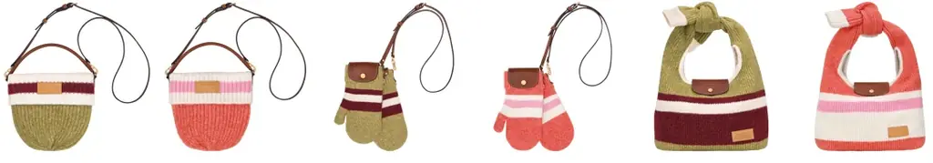 セーターやビーニー、ミトンといった冬の定番をバッグに取り入れたシリーズです。ピスタチオ&バーガンディ、コーラル&ピンクの鮮やかなストライプが用意され、ショルダーバッグ、ミトンバッグ、クロスボディなど複数のフォルムが揃います。