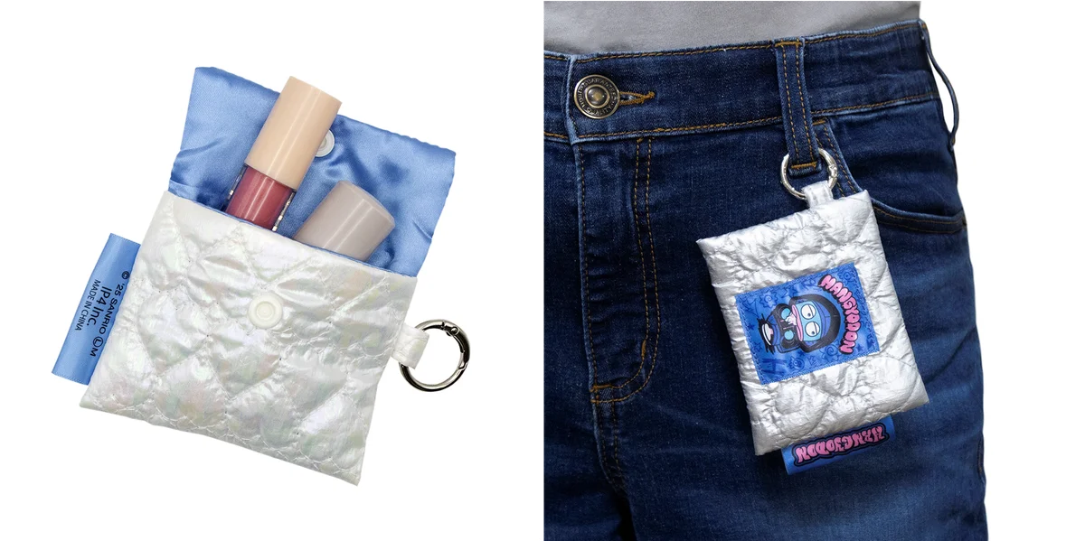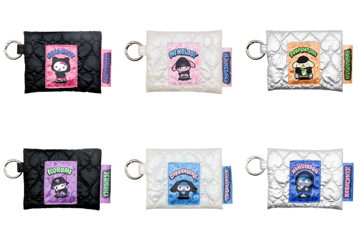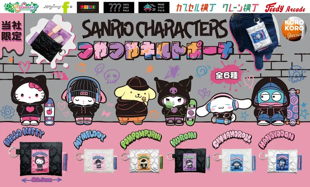 ラインナップは「ハローキティ」「マイメロディ」「ポムポムプリン」「クロミ」「シナモロール」「ハンギョドン」の全6種類です。素材には光沢のあるキルト生地を使用し、ステッチが目立つデザインで小物入れに適したサイズ感に仕上げられています。