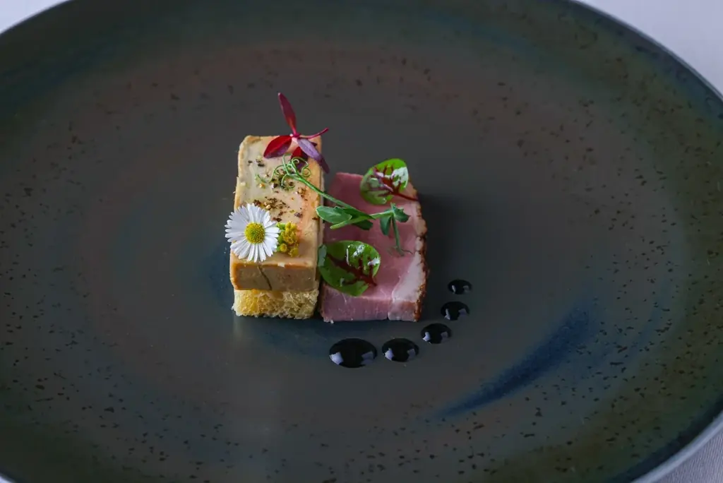 - Hors d’oeuvre [塩味]:フォアグラのテリーヌ、近江鴨の軽い燻製と自家製ブリオッシュ