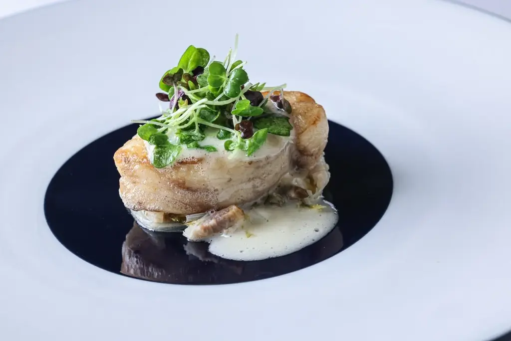 - Poisson [酸味]:鮟鱇のムニエルと北寄貝のグリエ、ソースブールブラン、ポワロー葱とオレンジ白菜、ポワトリーヌセッシュのエチュベ