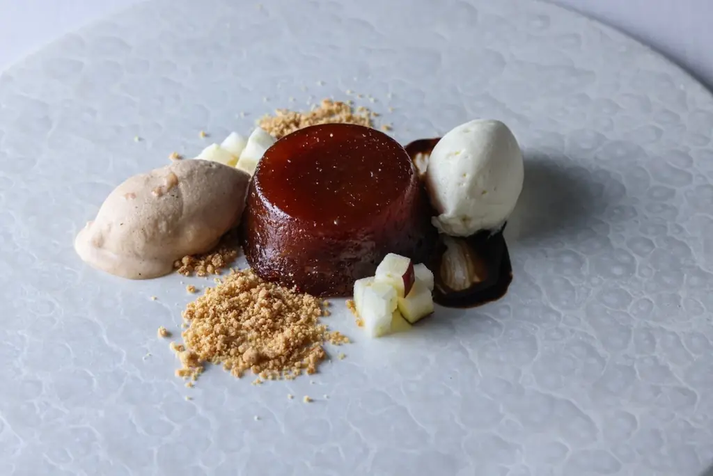 - Dessert [苦味]:タルトタタンとプラリネのジェラート、フレッシュなりんごとバルサミコのアクセント
