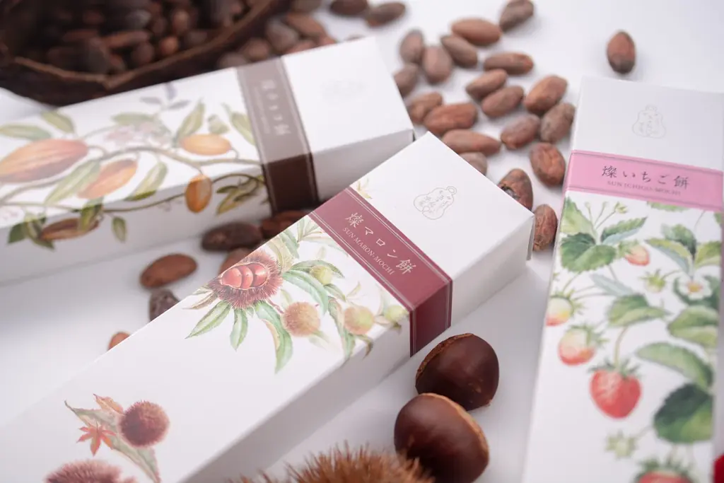 「燦(さん)」シリーズは、“あん”を主体に味わうことを意図した餅菓子群で、いちご・カカオ(チョコ)・栗という“太陽の実”を素材にした三種が揃います。手描き風の温かみあるパッケージで、年末年始の贈り物や自分向けの購入にも向く構成です。