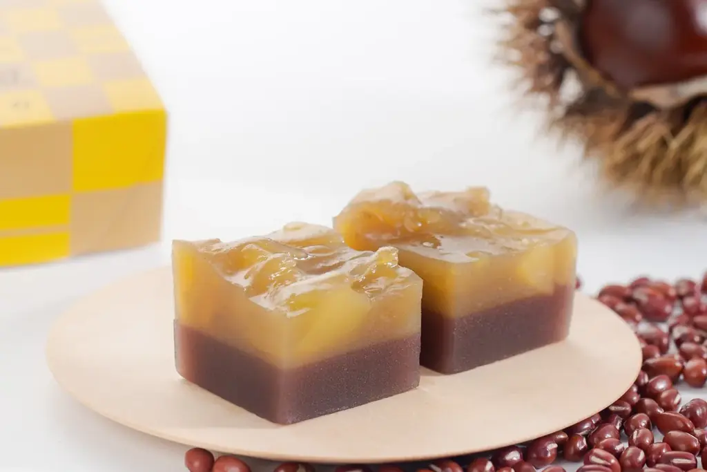 - 栗の甘露煮を入れた栗羊羹と、北海道産あずきのこし餡羊羹を重ねた羊羹。栗の風味とあんのなめらかさを重ねて楽しめます。